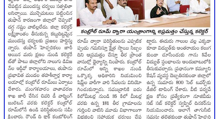 ప్రకృతి వైపరీత్యాలను ఎదుర్కొనేందుకు ఆధునిక సాంకేతిక పరిజ్ఞానాన్ని వినియోగించి ప్రాణ నష్టం లేకుండా చూసేందుకు ఏర్పాట్లు చేస్తున్నామని కలెక్టర్ బి.లక్ష్మీకాంతం చెప్పారు. తుపాను ప్రభావంపై ఆయన ఈనాడుతో మాట్లాడారు. ప్రస్తుత అంచనా ప్రకారం 17 వ తేదీ నాటికి తీరం చేరుకునే అవకాశం ఉందని, బందరు సమీపంలో తీరం దాటితే జిల్లాపై అధిక ప్రభావం ఉంటుందని అంచనా వేస్తున్నామన్నారు. దీనికి తగిన విధంగా ఏర్పాట్లు చేస్తున్నామని తెలిపారు. దిశ మార్చుకుని వెళితే ప్రభావం తక్కువగా ఉంటుందని, అన్నింటికి సిద్ధమవ్వాలని అధికార యంత్రాంగాన్ని అప్రమత్తం చేశామన్నారు. పరిస్థితిని బట్టి పునరావాస కేంద్రాలను ఏర్పాటు చేస్తామని వివరించారు.