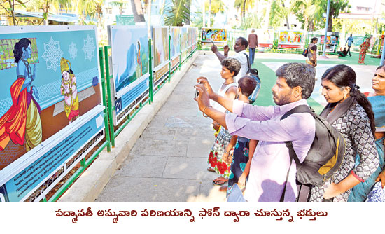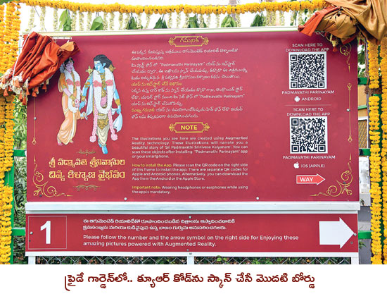 ఈనాడు, తిరుపతి: తిరుమల తిరుపతి దేవస్థానం సాంకేతికత ద్వారా ధర్మ ప్రచారానికి శ్రీకారం చుట్టింది. దేశంలోనే ఏ ఆలయంలో ఇప్పటివరకు లేని సాంకేతికతను భక్తులకు పరిచయం చేస్తోంది. ‘ఆగ్మెంటెడ్ రియాలిటీ టెక్నాలజీ’ ద్వారా పద్మావతి శ్రీనివాస కల్యాణం జరిగిన తీరును భక్తులకు కళ్లకు కట్టినట్లు చూపేలా ఏర్పాట్లు చేసింది. సరికొత్త సింట్రిల్లా సాంకేతిక పరిజ్ఞానంతో హైదరాబాద్కు చెందిన సంస్థ దీన్ని రూపొందించింది. తితిదే జేఈవో లక్ష్మికాంతం దీనికి కావాల్సిన సరంజామాను అందించారు. తితిదే ఆగమ శాస్త్ర సలహాదారుల సూచనల మేరకు పద్మావతీ కల్యాణం జరిగిన తీరును పూర్తిస్థాయిలో వివరించేలా ప్రదర్శనకు రూపుదిద్దారు. చదువురాని వారు, చిన్నారులు సైతం చేతిలో సెల్ఫోన్ ఉంటే చాలు స్కాన్ చేసి.. బొమ్మలు చెప్పే పరిణయ క్రమాన్ని చూడొచ్చు. వినొచ్చు. శుక్రవారం నుంచి ఈ ప్రదర్శన అందుబాటులోకి వచ్చింది. అమ్మవారి దర్శనానికి రోజుకు సగటున 25వేలమంది వరకూ వస్తుంటారు. వీరిలో ఎక్కువభాగం ఫ్రైడేగార్డెన్లో సేద తీరుతారు. ఆ సమయంలో వీరికి ఇది ఆధ్యాత్మిక చింతన కలిగిస్తుందని తితిదే భావించి ఈ ప్రదర్శన ఏర్పాటు చేసింది. ఈ ప్రదేశంలో మొత్తం 31 వినాయిల్ బోర్డులు ఏర్పాటు చేశారు. అక్కడికి వచ్చిన భక్తులు ఆ పరిణయ వేడుకలను బోర్డుల ద్వారా చూడాలంటే గూగుల్ ప్లేస్టోర్లోకి వెళ్లి పద్మావతి పరిణయం అని టైపు చేసి యాప్ను డౌన్లోడ్ చేసుకోవాలి. ఆ తర్వాత మొదటి బోర్డు వద్దకు (మొత్తం 31) వెళ్లి అక్కడున్న క్యూఆర్ కోడ్ను స్కాన్ చేయాలి. స్కాన్ అనంతరం ఒక్కొక్క బోర్డు వద్ద ఆరడుగుల దూరంలో నిలబడి బోర్డులకు సెల్ఫోన్ చూపాలి. అప్పుడు బొమ్మలు చెప్పే కథాంశం ఫోన్లో ప్రారంభమవుతుంది. ఒక్కొక్క బోర్డు వద్ద 20 సెకన్ల నుంచి 40 సెకన్ల వరకు నిడివి ప్రదర్శన ఉంటుంది. అలా 30 బోర్డుల్లోని కథాంశాలు అమ్మవారి జననం నుంచి వివాహం వరకూ వరుసగా వస్తూంటాయి. దీన్ని వినియోగించే సమయంలో హెడ్ఫోన్లు పెట్టుకోవాలి. ప్రాజెక్టుకు రూ.15 లక్షల వరకు ఖర్చయింది. దిల్లీ, నెల్లూరుకు చెందిన ఇద్దరు దాతలు ఈ వ్యయాన్ని తమ భుజాన వేసుకున్నారు. అమ్మవారి వివాహ ఘట్టాల్లో కీలకమైన అధ్యాయాలపైకి పూర్తిస్థాయి పరిశోధన చేసిన జేఈవో లక్ష్మికాంతం దీన్ని రూపొందించడంలో కీలకపాత్ర పోషించారు.