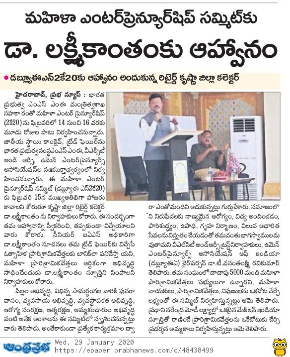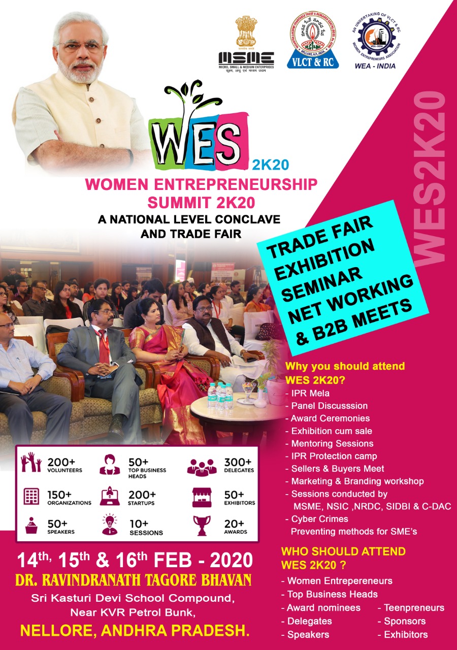 Women Entrepreneurship Summit (WES – 2K20) A National level conclave & Trade fair on 15th February, 2020 at Ravindranath Tagore Bhavan, Nellore, Andhra Pradesh,